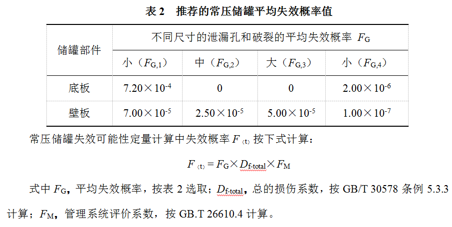 以《無損檢測 常壓金屬儲罐聲發(fā)射檢測及評價方法》(JB/T 10764-2007 )規(guī)定,按表2選取常壓儲罐底板和壁板的平均失效概率為小、中、大3種泄漏孔和破裂共4種損壞形式出現(xiàn)的概率。
