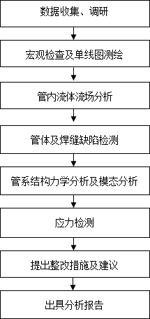 (7)依據(jù)管道的受力情況,結(jié)合流場(chǎng)分析及應(yīng)力理論分析結(jié)果,提出振動(dòng)減緩措施建議,同時(shí)綜合管道現(xiàn)場(chǎng)檢測(cè)評(píng)價(jià)結(jié)果及管道受力情況,最終確定管道的安全狀況,提出運(yùn)行維護(hù)建議及措施。