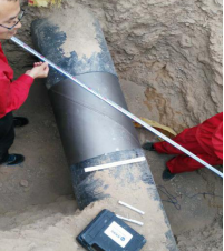 實際工作中,先找出內檢測缺陷位置上下游最近的可識別特征,再用幾何測量微積分法確定參考環(huán)焊縫位置及內檢測缺陷位置。某內檢測缺陷開挖定位現場作業(yè)如圖5和圖6所示。