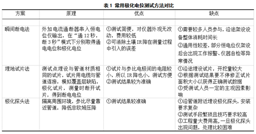 目前,國內(nèi)較為常用的極化電位測試方法主要有瞬間斷電法、埋地試片法和極化探頭法,其中瞬間斷電法已有較為成熟的技術(shù)和儀器,但具體使用功能仍存在一定局限(表 1)。