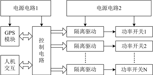 基于負(fù)載切換方案的管道極化電位測試方法,主要在原測試儀器的基礎(chǔ)上改進(jìn)研發(fā)新型GPS電流通斷器,依靠內(nèi)部負(fù)載實現(xiàn)電流的通斷以及保證恒電位儀正常工作。其系統(tǒng)組成主要包括控制器電路、GPS模塊、驅(qū)動電路、功率電子開關(guān)、隔離電源電路及人機(jī)交互等電路構(gòu)成(圖 1)。