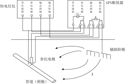 基于負(fù)載切換方案的管道極化電位測試方法, ①適用于通用型恒電位儀,具有多路(≥2路)電流通斷控制功能;②以GPS時間信號為基準(zhǔn),能夠?qū)崿F(xiàn)多臺恒電位儀輸出同步通斷;③同步時間誤差≤0.5 s;④恒電位儀額定電壓≤50 V,額定電流≤20 A。