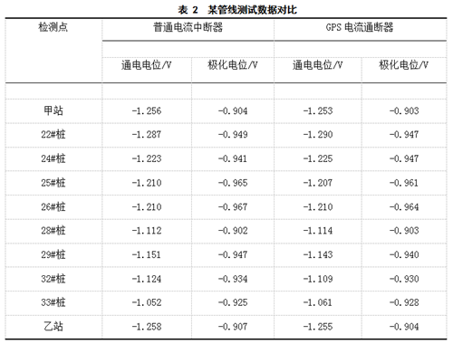 測試人員首先在甲、乙兩站架設(shè)普通電流中斷器進(jìn)行同步通斷測試,沿管線選擇10個點(diǎn)進(jìn)行極化電位測試,完成后又立即將電流中斷器更換為研發(fā)的GPS電流通斷器,再次對之前選點(diǎn)進(jìn)行數(shù)據(jù)收集,測試過程中,兩站GPS顯示時間同步,且通斷電位在15 s周期內(nèi)無波動。測得數(shù)據(jù)對比見表2。