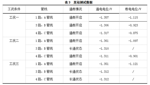測試人員將GPS電流通斷器多路樣機(jī)接入恒電位儀,控制A管線、B管線和 C管線三路通斷① 用恒電位儀1、3、4路分別向A管線、B管線和、C管線進(jìn)行送電。設(shè)置好樣機(jī)運(yùn)行模式,對三路輸出進(jìn)行同步通斷電;② 在連接不變的情況下,對1、4路通斷,3路不通斷;③ 在連接不變的情況下,對1路通斷,3、4路不通斷。測試過程中,恒電位儀運(yùn)行正常,萬用表測試電位示數(shù)穩(wěn)定,測試結(jié)果見表 3。
