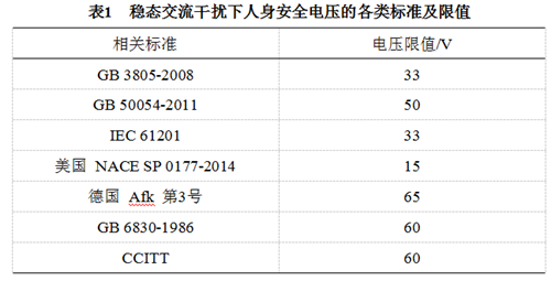 穩(wěn)態(tài)交流干擾危害,各國標(biāo)準(zhǔn)中人身安全電壓的限值見表 1 [6] 。其中美國NACE標(biāo)準(zhǔn)考慮比較全面,而且一般情況下15 V的穩(wěn)態(tài)安全電壓容易緩解達(dá)到,因此推薦使用。特殊情況下,可設(shè)置防觸碰裝置或均壓墊等措施進(jìn)行重點防護(hù)。