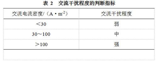 穩(wěn)態(tài)的交流干擾可能導(dǎo)致管道發(fā)生交流腐蝕。目前,對于交流腐蝕的評價指標(biāo)國際上尚未統(tǒng)一。GB/T 50698―2011《埋地鋼質(zhì)管道交流干擾防護(hù)技術(shù)標(biāo)準(zhǔn)》吸取了歐洲標(biāo)準(zhǔn)規(guī)定:當(dāng)管道上的交流干擾電壓不高于4 V時,可不采取交流干擾防護(hù)措施;高于4 V時,應(yīng)采用交流電流密度進(jìn)行評估。當(dāng)交流電流密度在30 A/m2以下時,交流腐蝕風(fēng)險較弱(表 2)。