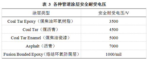 暫態(tài)交流干擾下管道上會產(chǎn)生很高的交流電壓,嚴(yán)重時會擊穿管道涂層。Dabkowski[7]給出了各種不同涂層的安全耐受電壓(表 3)。