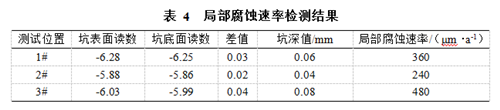 使用ER腐蝕探頭對強交流干擾下管道腐蝕速率進(jìn)行了實時監(jiān)測,監(jiān)測時間為2個月,將ER腐蝕探頭取出后,發(fā)現(xiàn)探頭存在較為嚴(yán)重的局部腐蝕現(xiàn)象(圖 2)。采用DDC-II型點腐蝕探測儀對探頭表面3個位置處的局部腐蝕速率進(jìn)行檢測,結(jié)果見表 4,遠(yuǎn)超ASTM標(biāo)準(zhǔn)中規(guī)定的10 μm/a限值。管道交流腐蝕風(fēng)險較高,亟需對其進(jìn)行緩解。此外,通過ER探頭測試結(jié)果可知試片的平均腐蝕速率為360 μm/a,這相當(dāng)于0.31 A/m2的直流電流的腐蝕量。而此處的交流電流密度為488.07 A/m2,表明約0.06%的交流電流密度產(chǎn)生了腐蝕。