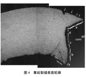 掃描電鏡檢查出5個明顯的裂縫區(qū)。圖 4給出了事故裂縫表面輪廓:(a)起始于管道的內(nèi)表面,表明腐蝕疲勞所引起的裂紋;(b)(c)(d)分別表示裂縫輻射面從管道表面45度變?yōu)閹缀醮怪保砻骼瓚?yīng)力和疲勞擴展,無明顯腐蝕;(e)表明裂紋擴展成為45度的剪切面。管道外表面鄰近的最終開裂區(qū)呈蜂窩狀,主要是延性過應(yīng)力裂紋。