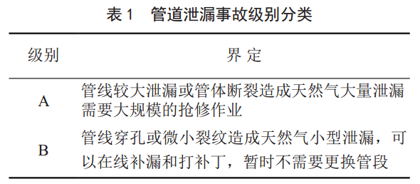 依據(jù)《國家安全生產(chǎn)管理局石油天然氣搶險(xiǎn)應(yīng)急預(yù)案》《石油天然氣管道安全規(guī)范》(SY6186-1996)、美國聯(lián)邦法規(guī)49CFR192對危害預(yù)防程序和應(yīng)急計(jì)劃的要求,以及管線失效機(jī)理的估算,確定管線泄漏事故級(jí)別(見表 1)。