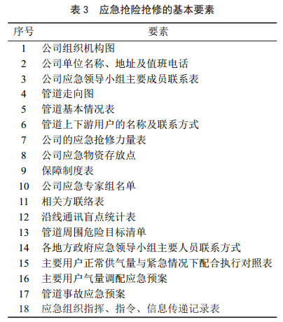 補(bǔ)充應(yīng)急儲(chǔ)備物資和損壞的應(yīng)急設(shè)備,分析研究與評(píng)價(jià)被損的管材指標(biāo),包括母材、焊縫、熱影響區(qū)拉伸、夏比沖擊,管材晶體結(jié)構(gòu)應(yīng)力應(yīng)變、塑性應(yīng)變,管材抵抗裂紋擴(kuò)展的邊界條件和能力。完善修訂公司應(yīng)急搶險(xiǎn)搶修的基本要素見表 3。