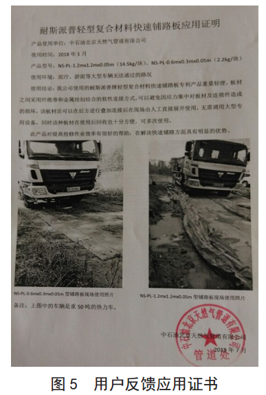 北京華油慧通管道技術(shù)服務(wù)有限公司和天津耐斯工程技術(shù)有限公司自2016年起歷時(shí)兩年開展輕型復(fù)合材料快速鋪路板研發(fā),經(jīng)過多次現(xiàn)場模擬試驗(yàn),產(chǎn)品最終達(dá)到檢驗(yàn)標(biāo)準(zhǔn)要求,通過了國家化學(xué)建筑材料測試中心在不同野外環(huán)境下的碾壓測試,主要包括泥地、水泥路、碎石路、土路及泥沼地帶等路況下的性能檢測。值得一提的是,該產(chǎn)品使用后經(jīng)過簡單修復(fù)還能繼續(xù)正常使用并同時(shí)通過了測試(圖 1)。該產(chǎn)品已獲頒國家實(shí)用新型專利證書(圖 2)。