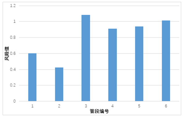 對某輸油管道的一個站間進行實際應(yīng)用。管道長90 km,輸送汽油,管徑610 mm,設(shè)計壓力8 MPa,運行壓力5 MPa。收集分析所需要的數(shù)據(jù),將管道最終劃分為6個管段。隨后對每個管段進行了風險計算,結(jié)果見圖 3。
