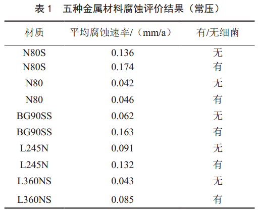實驗研究了N80S、 N80、 BG90SS、 L245N、L360NS五種金屬材料在頁巖氣返排液無菌/有菌環(huán)境中及常壓/高壓條件下的腐蝕狀況,結(jié)果得出以下結(jié)論。