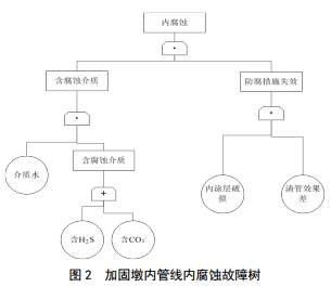 加固墩內(nèi)管線內(nèi)腐蝕故障樹如圖 2所示。內(nèi)腐蝕受含腐蝕介質(zhì)和防腐措施失效共同影響。天然氣屬干氣輸送,即使含有CO2、 H2S等腐蝕性成分,沒有水的存在,腐蝕就難以發(fā)生。因此,內(nèi)腐蝕風(fēng)險(xiǎn)相對較低,控制措施應(yīng)從監(jiān)控脫水效果和內(nèi)檢測監(jiān)控著手。