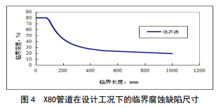 加固墩處管線管體腐蝕缺陷臨界尺寸和環(huán)向內(nèi)表面裂紋缺陷臨界尺寸,分別按ASME B31G―2012―3770和API 579計(jì)算,如圖 4、圖 5、圖 6所示。在下次內(nèi)檢測過程中,發(fā)現(xiàn)存在腐蝕型缺陷和環(huán)向裂紋缺陷,可按照圖 4~6給出的腐蝕缺陷臨界尺寸和環(huán)向裂紋缺陷臨界尺寸判斷是否可接受。當(dāng)評估點(diǎn)坐標(biāo)落在曲線下方時(shí),缺陷可以接受;評估點(diǎn)位于曲線上方 時(shí)缺陷不能接受。由此可判斷可能出現(xiàn)的缺陷是否處于可接受范圍內(nèi)。