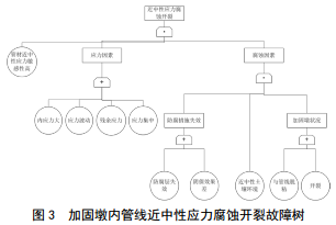 近中性應(yīng)力腐蝕開裂故障樹如圖 3所示。腐蝕開裂主要受管道材質(zhì)、應(yīng)力和腐蝕三個(gè)因素共同影響。管材、應(yīng)力、加固墩狀況、防腐層失效、近中性土壤環(huán)境均屬不可控因素,可控制因素只有陰保措施。需定期監(jiān)測管道陰極保護(hù),發(fā)現(xiàn)異常及時(shí)分析原因并處置,同時(shí)可采用裂紋型內(nèi)檢測方法監(jiān)控。
