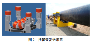 采用托管架發(fā)送道時需要管道滿足彎曲曲率,并能順利進入鉆孔。托管架的強度、剛度和穩(wěn)定性除在預(yù)制過程中滿足設(shè)計要求外,還應(yīng)在現(xiàn)場安裝過程中保證托管架基礎(chǔ)的穩(wěn)定性,在送管過程中,托管架不能傾倒,托管架傾倒可能損傷管道防腐層,甚至出現(xiàn)卡管,回拖無法進行(圖 2)。