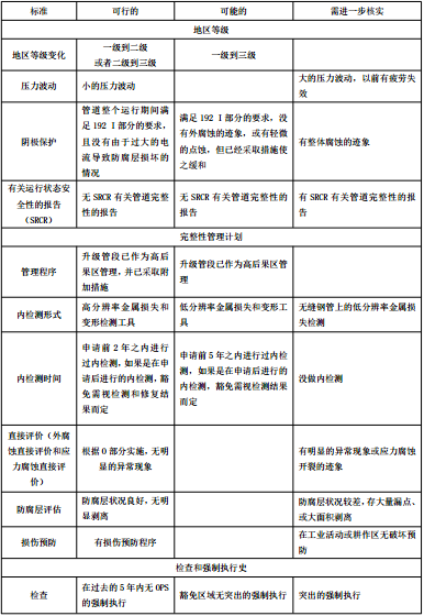 應(yīng)考慮每一份申請(qǐng)的完整性,對(duì)運(yùn)行時(shí)隱含高危險(xiǎn)的管道應(yīng)給予嚴(yán)格的審查,增大核實(shí)等級(jí)。表 1詳細(xì)列出了OPS在豁免管道等級(jí)時(shí)所考慮的管道設(shè)計(jì)參數(shù)和運(yùn)行情況,分為三個(gè)類別:①豁免是可行的;②豁免是可能的;③需進(jìn)一步核實(shí)才能豁免。