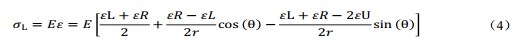 其中 r 為管道外徑, m; εL、 εU、 εR為L(zhǎng)點(diǎn)、 U點(diǎn)、 R點(diǎn)應(yīng)變值。