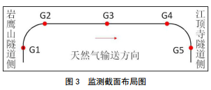 根據(jù)管道應(yīng)力計(jì)算分析以及光纖光柵傳感器的特點(diǎn)和適用條件,需要在管道每個(gè)截面上同時(shí)安裝3支應(yīng)變傳感器和1支溫度傳感器。每組監(jiān)測(cè)截面在管道頂端安裝1支溫度傳感器和1支應(yīng)變傳感器,與之垂直的管道兩側(cè)各安裝1支應(yīng)變傳感器。根據(jù)2015年12月西南管道公司與中國石油大學(xué)橋彎頭位置、橋梁桁架中部管道位置、東岸(江頂寺隧道側(cè))下橋彎頭位置為可能的應(yīng)力應(yīng)變最大區(qū)域,因此選擇這三處作為傳感器安裝位置。
