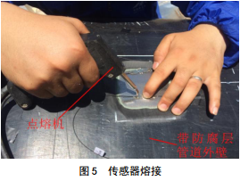 同時(shí)為了了解桁架兩端應(yīng)力的傳導(dǎo)方向,彎頭兩側(cè)需要安裝2組應(yīng)力應(yīng)變監(jiān)測(cè)截面。在每條管道的中部安裝1組應(yīng)力應(yīng)變監(jiān)測(cè)截面,桁架西岸上橋彎頭安裝2組應(yīng)力應(yīng)變監(jiān)測(cè)截面,桁架東岸下橋彎頭安裝2組應(yīng)力應(yīng)變監(jiān)測(cè)截面。因此,天然氣和原油2條管道共計(jì)安裝10組監(jiān)測(cè)截面,天然氣管道監(jiān)測(cè)截面布局見圖 3(原油管道布局相同),圖中灰色圓點(diǎn)位置表示傳感器安裝截面。每組監(jiān)測(cè)截面上安裝4支光纖光柵傳感器(含3支應(yīng)變傳感器和1支溫度傳感器),共計(jì)使用40支傳感器。傳感器現(xiàn)場(chǎng)安裝見圖 4,圖中含1支應(yīng)變傳感器和1支溫度傳感器。傳感器安裝部位需采用工具打磨去掉管道外表面防腐層與防腐漆,隨后對(duì)管道表面拋光處理并達(dá)到Sa1等級(jí),將傳感器安裝于拋光后的管道鋼體表面,使用點(diǎn)熔機(jī)進(jìn)行熔接,傳 感器熔接見圖 5。安裝完成后,底層防腐使用黏彈體防腐膏,在防腐膏之上滿纏黏彈體防腐帶,對(duì)已涂敷防腐膏的位置再次覆蓋,最后使用壓敏帶外防護(hù)。