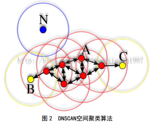 常用的聚類算法有k-means算法,試用后發(fā)現(xiàn)k-means算法基于平均距離決定同類聚集,適用于球形聚集,不適合民房空間分布。通過(guò)比較研究,選擇了具有噪聲的基于密度的DBSCAN(Density-BasedSpatial Clustering of Applications with Noise)聚類算法,該算法是以密度、而不是距離來(lái)計(jì)算簇和簇邊界。其基本思路(圖 2)是以建筑密集區(qū)域的某一建筑為圓心,選擇合適半徑畫圓,即規(guī)定了圓的半徑及圓內(nèi)最少包含的建筑密度。若圓內(nèi)建筑密度大于等于預(yù)先指定的值,那么這個(gè)圓圈的圓心就轉(zhuǎn)移至該圓圈內(nèi)的其他建筑,繼續(xù)畫圓去計(jì)算,直至圓內(nèi)所包含的建筑密度少于預(yù)先指定的值,聚類終止。基于密度的DBSCAN聚類算法適用于在管線周圍建筑分布區(qū)域中,去尋找高密度分布的區(qū)域,并與建筑分布形狀無(wú)關(guān)。