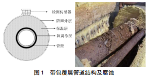 為了防腐和保溫,管道本體大都包裹在防腐層或保溫層等之下,這給常規(guī)檢測帶來了較大的困難(見圖 1)。檢測傳感器距離管道本體的距離稱為提離高度,受距離影響在高提離高度下的電磁響應(yīng)信號極其微弱、背景噪聲大。