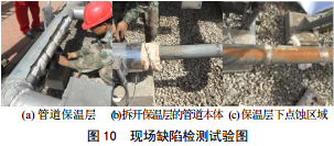 傳感器距離管道本體表面約為50 mm,測試速度為1 m/s,測試信號如圖 9所示。圖 9中存在三處疑似缺陷信號,如圖中標注。然后進行多次測試,信號基本保持穩(wěn)定。為驗證信號準確性,對包覆層進行剝離,如圖 10所示。剝離最外層白鐵皮,發(fā)現(xiàn)白鐵皮下存在固定保溫棉的細鐵絲,鐵絲間距約20 cm,與測試中的疑似缺陷信號對應(yīng)。進一步剝離保溫層,管 道外表面存在輕微點蝕。
