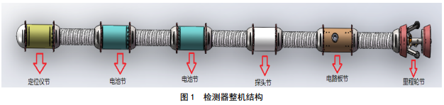 管道內(nèi)腐蝕檢測器包括裝置定位器、萬向節(jié)、定位電池組、探頭電池組、電磁發(fā)射與渦流檢測裝置、速度控制板、電路控制和數(shù)據(jù)存儲裝置、裝置位置接收器、里程計(jì)數(shù)輪和驅(qū)動皮碗幾個(gè)功能組件,整機(jī)結(jié)構(gòu)如圖 1所示。