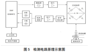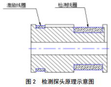 渦流探頭采用近場電磁檢測原理制作而成,在電路的設(shè)計(jì)上充分考慮和探頭的良好電氣匹配。探頭結(jié)構(gòu)原理見圖 2。