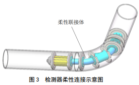 優(yōu)選采用不銹鋼彈簧連接方式,確保檢測器實(shí)現(xiàn)柔性連接,能夠自由順暢的通過1.5 D的彎頭,保證整機(jī)強(qiáng)度,以應(yīng)對高壓水流推動。見圖 3。