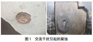 交流干擾危害有三種,一是潛在威脅操作人員的人身安全;二是強(qiáng)電干擾能沖擊沿途監(jiān)控閥室的電動(dòng)執(zhí)行機(jī)構(gòu)和工藝站場的電氣儀表自動(dòng)化設(shè)施,包括陰極保護(hù)站的恒電位儀;三是交流感應(yīng)電壓能引起交流腐蝕(圖 1),而且這種腐蝕是陰極保護(hù)所不能完全有效控制的,目前國內(nèi)外在交流腐蝕方面已經(jīng)頒布了不少研究報(bào)告或交流腐蝕控制標(biāo)準(zhǔn)。