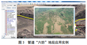 (1)“六防”區(qū)域管理。確定六防區(qū)域位置,收集典型照片,進(jìn)行現(xiàn)狀描述。某管道滑坡段位于延安市志丹縣雙河鄉(xiāng)墩梁村,屬濕陷性黃土V字型陡坡地段,通過該系統(tǒng),可對管線所經(jīng)區(qū)域地形地貌、高度落差、周邊道路情況、泄漏流向、圍堵點(diǎn)選擇等進(jìn)行鳥瞰瀏覽(圖 3)。