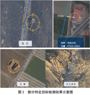 基于卷積神經(jīng)網(wǎng)絡(luò)的無人機(jī)油氣管線巡檢系統(tǒng)可以實(shí)現(xiàn)實(shí)時(shí)影像檢測,效果如圖 2所示。前期針對非法占壓、工程車輛、溝槽開挖、動(dòng)土痕跡、鉤機(jī)、鏟機(jī)、地表破壞、水土流失等特征進(jìn)行自動(dòng)識(shí)別檢測,并自動(dòng)出具報(bào)表和統(tǒng)計(jì)分析。及時(shí)發(fā)現(xiàn)和定位違法及安全隱患點(diǎn),及時(shí)處理推送執(zhí)法信息,做到防患于未然,實(shí)現(xiàn)采用自主航跡規(guī)劃巡視的巡檢方式,高效安全地執(zhí)行巡檢任務(wù)。