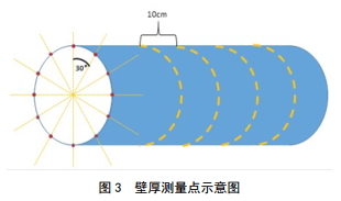 根據(jù)報(bào)告中GPS數(shù)據(jù),定位埋地管道的腐蝕點(diǎn),取腐蝕點(diǎn)軸向±0.5 m作為測(cè)試管段開(kāi)挖驗(yàn)證。以管道截面30°為1個(gè)壁厚測(cè)試點(diǎn),進(jìn)行環(huán)向標(biāo)記,測(cè)試環(huán)線間距10 cm(圖 3)。每處腐蝕位置共計(jì)檢測(cè)120個(gè)壁厚數(shù)據(jù)并記錄。取壁厚最薄的數(shù)據(jù)對(duì)比磁應(yīng)力檢測(cè)結(jié)果,驗(yàn)證其準(zhǔn)確性。