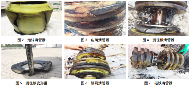 根據(jù)內(nèi)檢測(cè)計(jì)劃,2017年9月5日至2018年8月8日,先后對(duì)該管段發(fā)送泡沫、皮碗、測(cè)徑板、鋼刷、磁鐵清管器各一次及模擬體兩次,均順利收球(圖 2-7),清出污物較多(鐵條13根),但清管器密封板均有劃痕,測(cè)徑板均出現(xiàn)變形。