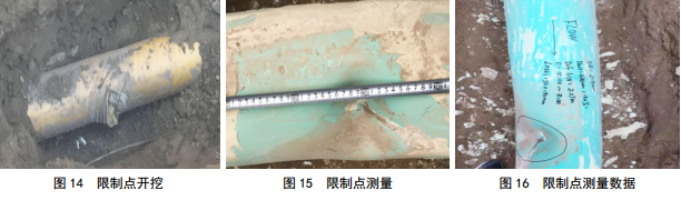 根據(jù)管道遺留存儲(chǔ)器數(shù)據(jù)讀取分析,里程存儲(chǔ)數(shù)據(jù)截止于A點(diǎn)1號(hào)閥室外110 m處,與檢測(cè)器卡堵時(shí)A點(diǎn)壓力劇烈波動(dòng)點(diǎn)相吻合。開挖后發(fā)現(xiàn)限制點(diǎn)凹陷(圖 14-16)。
