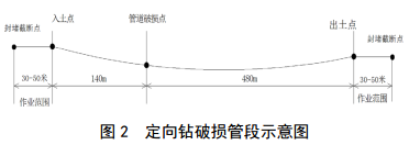 全部搶修施工在定向鉆入土點(diǎn)和出土點(diǎn)位置進(jìn)行(圖 2),關(guān)鍵施工技術(shù)是對破損管段兩端帶壓封堵、清管拉拔以及新管線回拖安裝等。