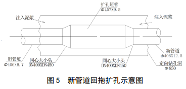 Φ 457×9.5 mm短管(圖 5)連著舊管道一起回拖,同時(shí)給新管道引成了擴(kuò)孔回拖空間。