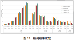 經(jīng)檢測(cè)所有加工缺陷,在0.25~3.00 mm深度范圍內(nèi),檢測(cè)誤差+/-10%;同時(shí)也通過了最大提離2mm驗(yàn)證。但對(duì)于長(zhǎng)度短于5 mm的較小缺陷,特別是長(zhǎng)度與深度比小于3的缺陷,檢測(cè)結(jié)果略微偏小。結(jié)果如圖 13所示。