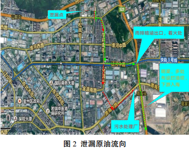 (1)漏油現(xiàn)場情況。管道噴出地面的原油蔓延至附近的街道路面,部分原油通過路面的水箅子或窨井進入市政雨水管網(wǎng)和污水管網(wǎng),污水管網(wǎng)的原油流入污水處理廠,雨水管網(wǎng)的原油則流入排水明渠。管道泄漏的油品為阿曼原油,凝點-30℃,輕質成分較多,揮發(fā)性較強。