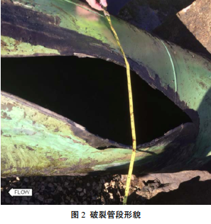 管道開挖后,在破裂位置發(fā)現(xiàn)了施工期間安裝的混凝土配重塊。破裂管段和一部分配重塊運往NTSB的材料實驗室進行檢測。圖 2為開挖后運送至NTSB前破裂管段形貌。