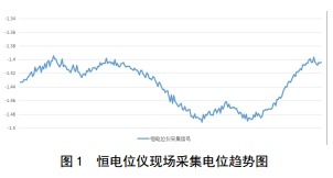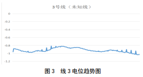 (3)通過對絕緣接頭保護器接線進行電位同步監(jiān)測,站內線(線 1)電位最大值為﹣1.2 704 Vcse、最小值﹣1.2 949 Vcse,電位波動0.02 V;站外線(線 2)最大值為﹣1.6 120 Vcse、最小值﹣1.6 671 Vcse,電位波動0.05 V;未知線(線 3)直流電位波動較大,最大值為﹣0.8 147 Vcse,最小值﹣1.1 998 Vcse,電位波動0.38 V,存在尖峰電壓、直流干擾,并且未知線和站外管線搭接,當存在較大的直流干擾時,可將干擾傳遞至線路陰保恒電位儀(圖 3)。