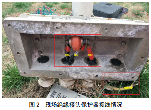 (2)對進站絕緣接頭保護器進行排查,發(fā)現(xiàn)絕緣接頭兩側有3根導線連接。經電位分析,線 1和線 2分別為站內線、站外線,線 3為未知線(圖 2)。