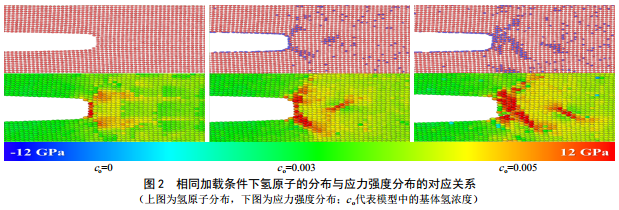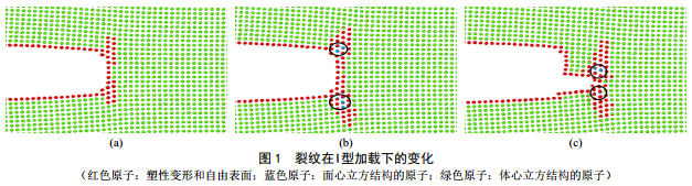 在無氫原子情況下,裂紋尖端優(yōu)先通過塑性變形釋放能量(圖 1中紅色原子),并隨著應(yīng)變能持續(xù)增加,能量卸載方式會(huì)由塑性變形轉(zhuǎn)為相變(圖 1中藍(lán)色原子為相變?cè)樱挥挟?dāng)應(yīng)力強(qiáng)度達(dá)到1.45 MPa·m0.5時(shí),相變、塑性變形無法釋放過剩的應(yīng)變能,鈍化的裂紋尖端開始產(chǎn)生微觀裂紋,材料失效。