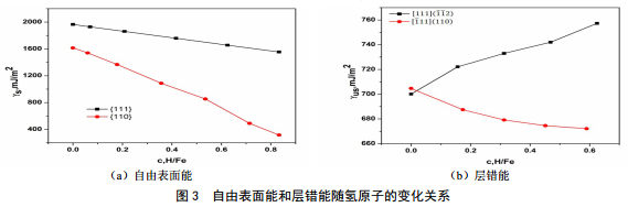 相變的發(fā)生主要依賴于溫度和內(nèi)應(yīng)力的變化,氫原子對(duì)其影響不大。斷裂的發(fā)生主要依賴于自由表面能,位錯(cuò)發(fā)射主要依賴于層錯(cuò)能,因此自由表面能和層錯(cuò)能受到關(guān)注和研究(圖 3)。