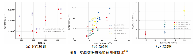 ,高強(qiáng)度的鋼,由于塑性區(qū)小,塑性變形產(chǎn)生的缺陷對(duì)氫原子的囚禁作用不明顯,氫擴(kuò)散相關(guān)的裂紋擴(kuò)展速率更多的依賴于HEDE機(jī)制,因此強(qiáng)度越高的鋼, n 的數(shù)值越接近于 1 。 此 觀 點(diǎn) , 可 在 圖 5 中 被 印 證 , H Y 1 3 0 鋼(σys=932 MPa)不同溫度下的裂紋生長速率值,在 n 值為0.98時(shí)和預(yù)測值(空心點(diǎn))較為吻合,而X65(σys=448 MPa)鋼材在n值為0.95時(shí)數(shù)據(jù)擬合較好,X52鋼材(σys=382 MPa) n值為0.88時(shí)數(shù)據(jù)都擬合較好。因此總裂紋擴(kuò)展速率可以公式(7)表示。