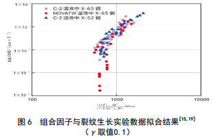 圖 6所示為C-2和NOVATW溶液中X65鋼中裂紋生長速率以及C-2溶液中X52鋼中裂紋生長速率與加載組合因子的關(guān)系, 其中γ取值為 0.1 時(shí)所有數(shù)據(jù)擬合結(jié)果較好。擬合的組合因子在X軸上存在一個(gè)門檻值500 MPa·m0.5,低于這個(gè)門檻值時(shí),裂紋不會(huì)生長,呈現(xiàn)惰性;在500到1 000 MPa·m0.5 則為緩慢增長階段,屬于裂紋增長的激活區(qū);高于1 000 MPa·m0.5為裂紋快速增長階段。組合因子的這些門檻值可以直接用來預(yù)測微觀裂紋所處的狀態(tài),方便判斷管道所處的狀態(tài)和管道的維護(hù)。