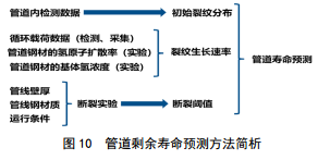 圖 10簡要概述了管道壽命預(yù)測的步驟,首先通過內(nèi)檢測,獲取管道初始裂紋狀態(tài);通過站場傳感器收集管道內(nèi)的應(yīng)力變化情況;通過實(shí)驗(yàn)和模擬得到氫原子擴(kuò)散和濃度的基本參數(shù);通過斷裂實(shí)驗(yàn)測得管道失效的閾值;結(jié)合軟件計(jì)算出的裂紋生長速度和裂紋長度變化,計(jì)算管道剩余壽命,每次內(nèi)檢測結(jié)束后,及時(shí)收集數(shù)據(jù),與模型之前的預(yù)測結(jié)果進(jìn)行比較,反復(fù)驗(yàn)證,通過機(jī)器學(xué)習(xí)的方法,可以使預(yù)測準(zhǔn)確性不斷提高。